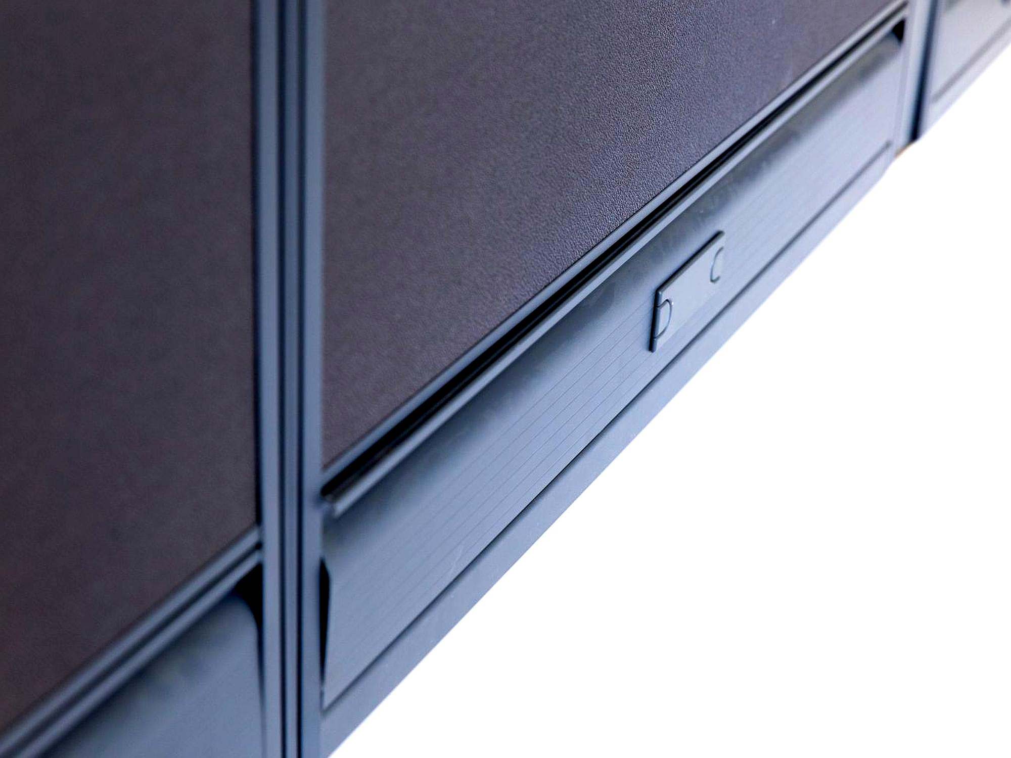 Network connectors, phone jacks, and electrical outlet conduits are built into the Emerald Cubicle Collection™. No need for messy extension cords or CAT ethernet cables making a mess underneath your desk. Flip-up access panes reveal these “raceways” tracks at the base of each wall which allow for cord management in a safe and efficient way (professional electrician recommended for installation). A clever solution and yet another benefit of using the Emerald Cubicle Collection™ for your cubicles.