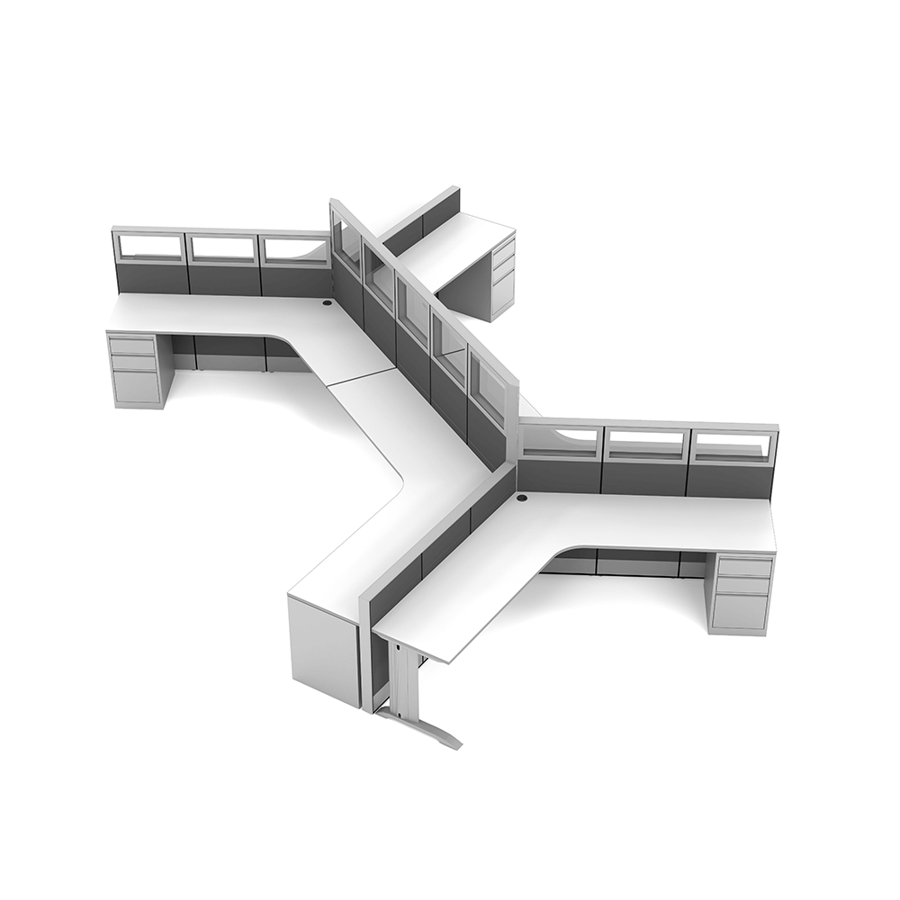 120 degree cubicles create a more unique shape and style for multiple cubicles workstations. Take the right angles and “square” design out of the picture and replace with with a truly distinctive look. These look great in any space, including showrooms, libraries, and classrooms.