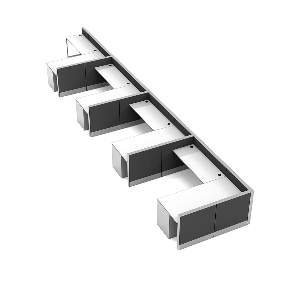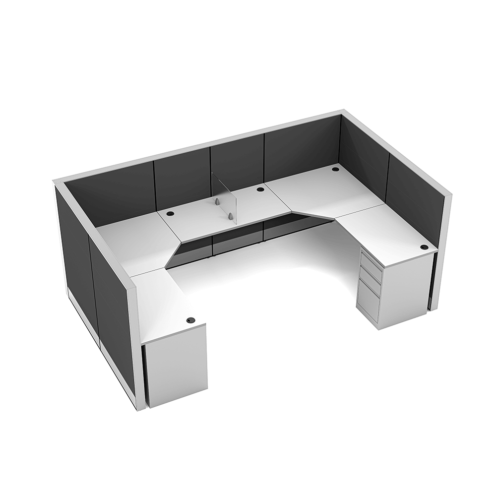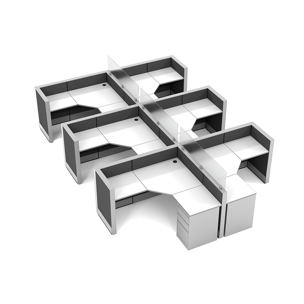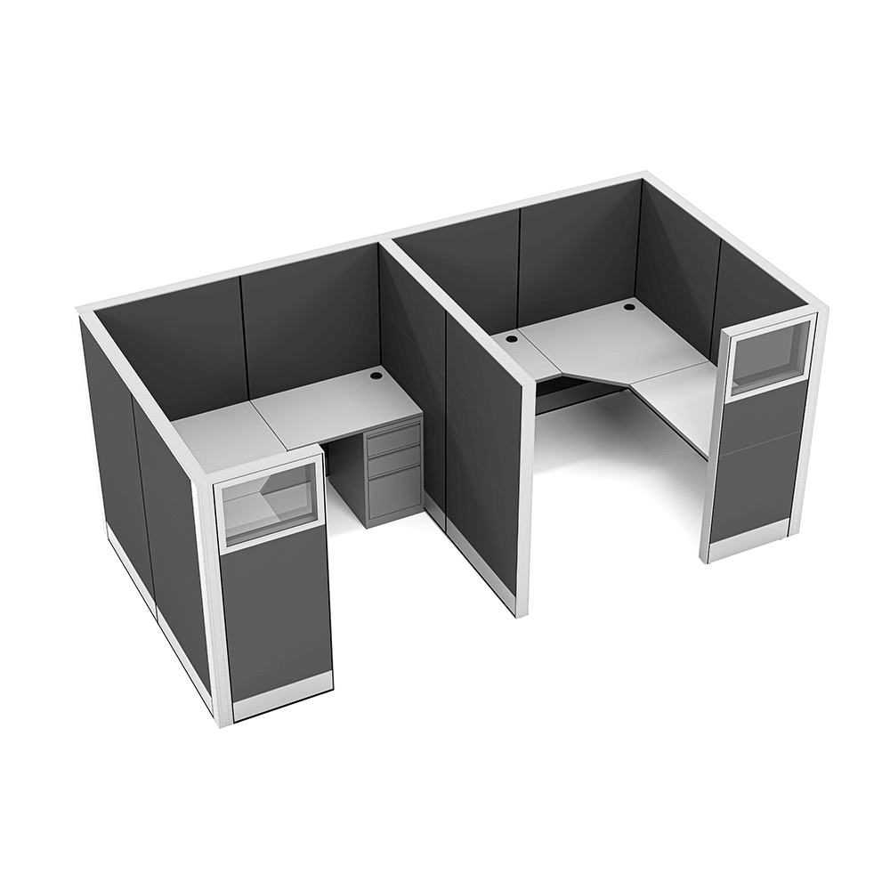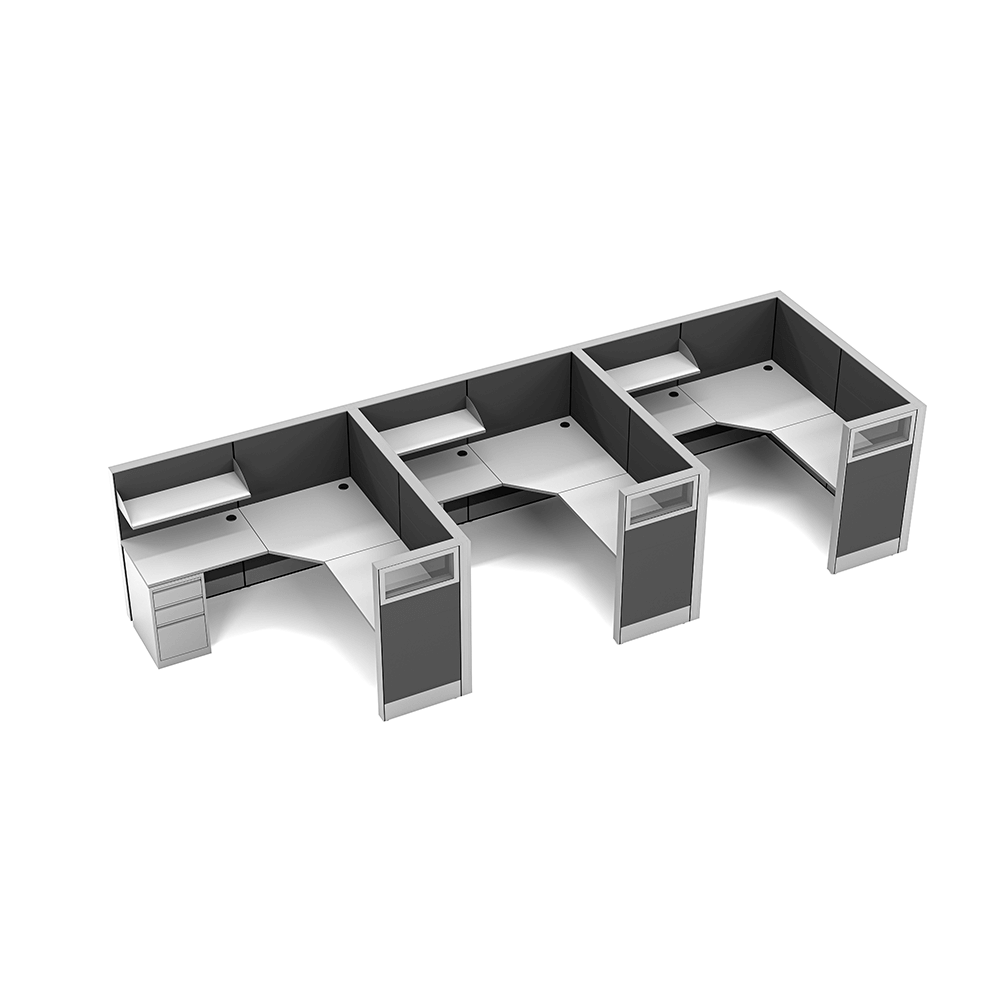 L-shaped cubicles are a standard design for office cubicles. It’s design is to maximize worksurface space for monitors, file storage, organizers, phones, or anything else needed for a productive workspace. This scalable design allows for a single cubicle or dozens, depending on your needs.