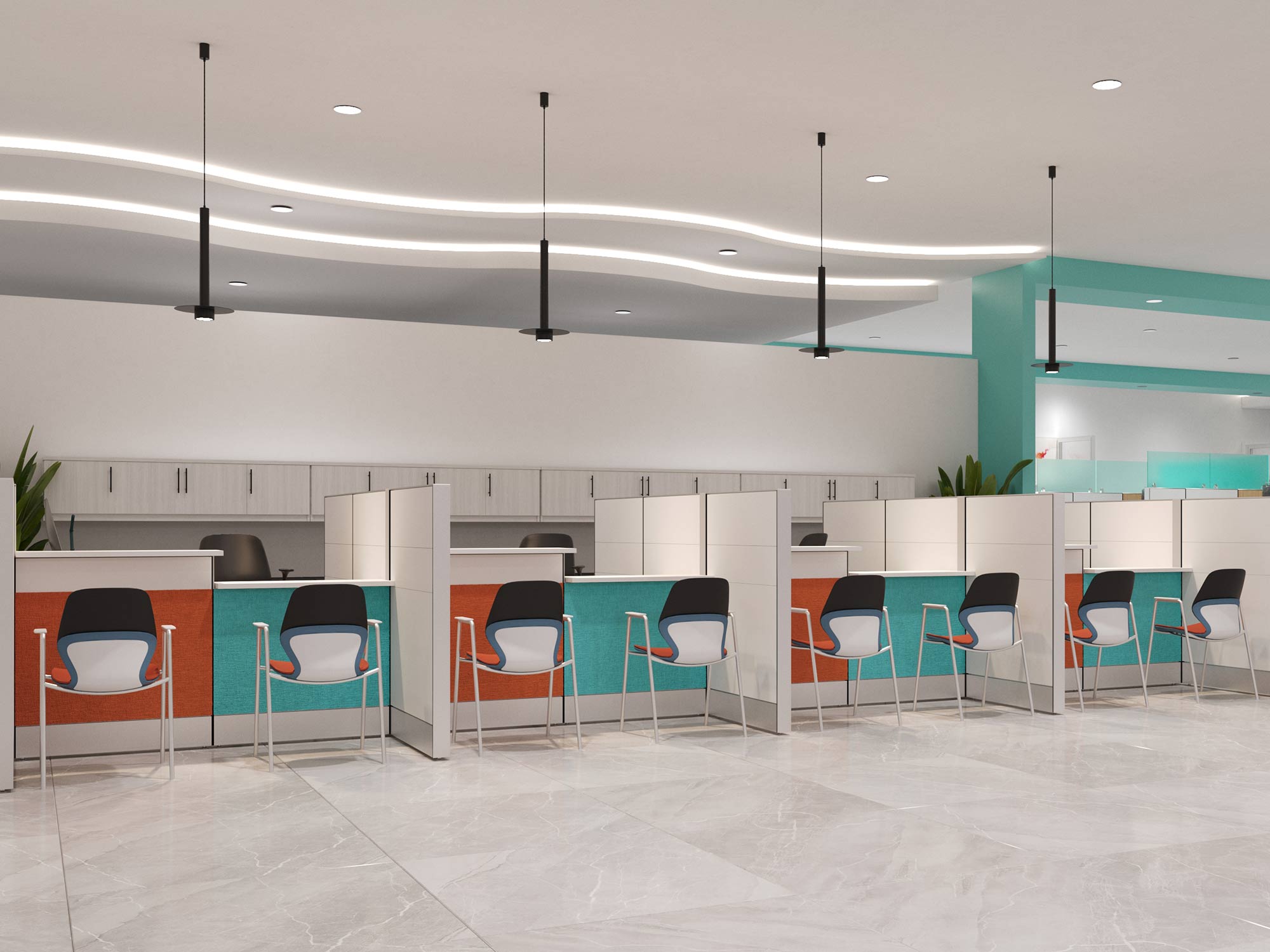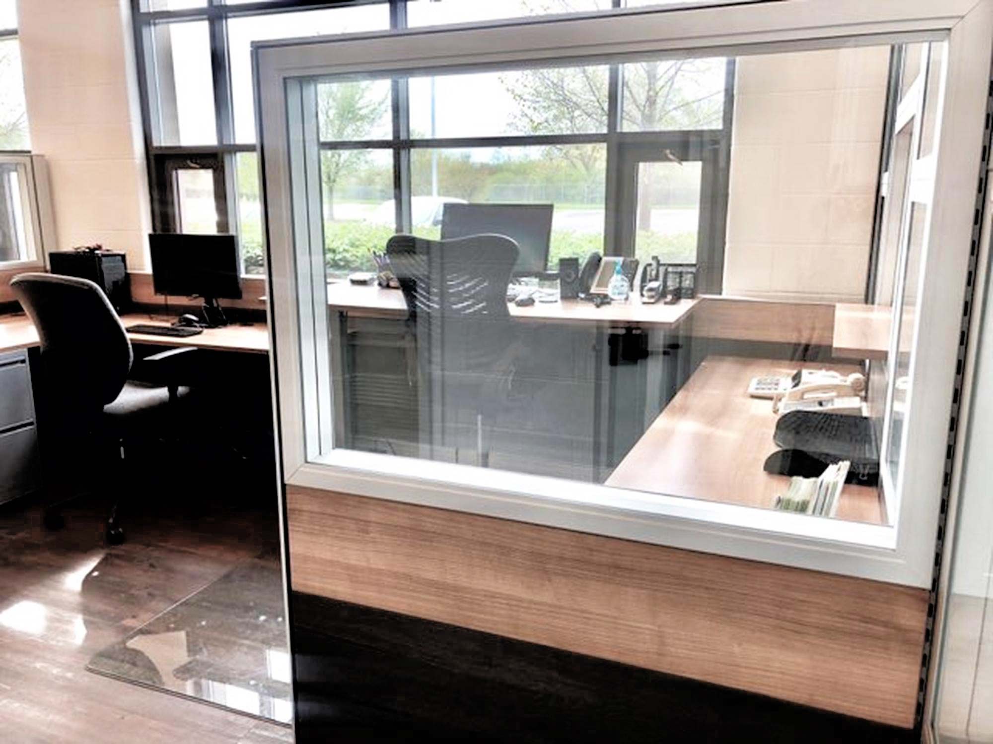 Reception cubicles and desks generally feature seating for one or two employees, transaction shelves or pass through windows, and ample space under and/or above the worksurface area for file storage cabinets and organizational bins.